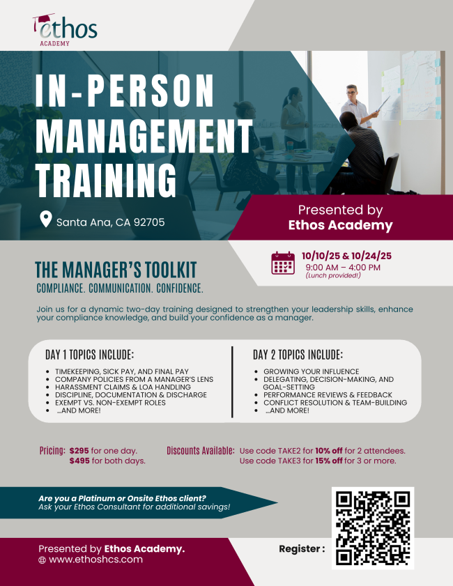 Whether you’re a newly promoted manager or need a refresher, our upcoming Manager’s Toolkit Training Session is the perfect way to build confidence, sharpen your communication skills, and understand compliance in the ever-changing regulatory landscape. These sessions will set you and your team up for success.
